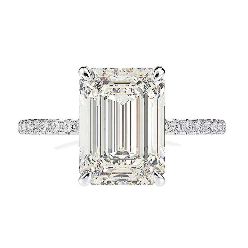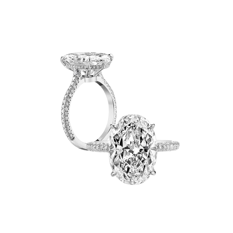 A truly elegant piece. Available in oval, radiant, emerald, elongated cushion. VVS/DEF/colorless moissanite center stone and a diamond setting.